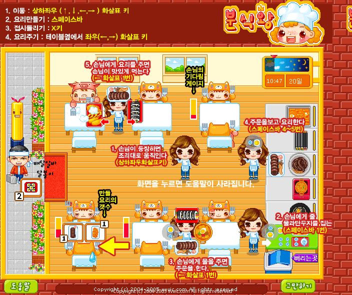 - 음식 서빙: 테이블 옆에있는 왼쪽 및 오른쪽 화살표 키 (←, →)를 사용하세요.